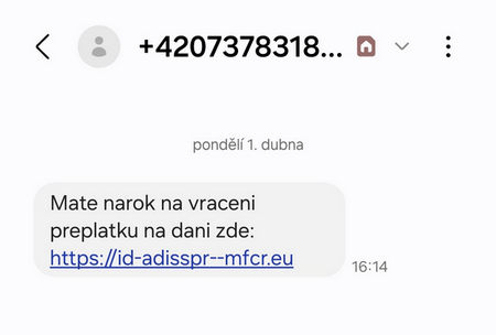 So sah zum Beispiel eine betrügerische Textnachricht für Steuererklärungen aus, die von Betrügern verschickt wurde, die vorgaben, vom Internal Revenue Service zu sein. Die echte Webadresse des Portals My Taxes lautet https://adisspr.mfcr.cz/. Auf den ersten Blick sieht die Nachricht sehr plausibel aus.
